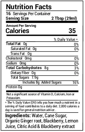 A  refreshing ginger beer syrup with perfect flavor combination of blackberry tartness, citrus sweetness and a moderate touch of ginger spice. Reconstitute using 1 part of syrup with 2.5 – 3 parts of your choice of bubbly and create your own custom cocktail or mocktail.  Only 35 calories per serving. Size: 16 fl. Oz Item Id: GCB31-01 Makes up to (16) 5 oz. mule cocktails/mocktails Save with a flat shipping rate