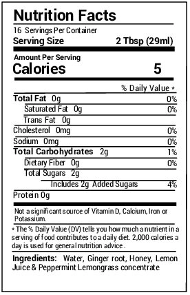A Wellness Shot providing a healthy dose of antioxidant ginger and anti-emetic peppermint in a convenient package. A potent combination that may provide relief from digestive issue, nausea, upset stomach, etc. Take it straight or use to flavor your choice of beverage. Made with honey it has less than 2 gm of carbs with only 7 calories per serving.