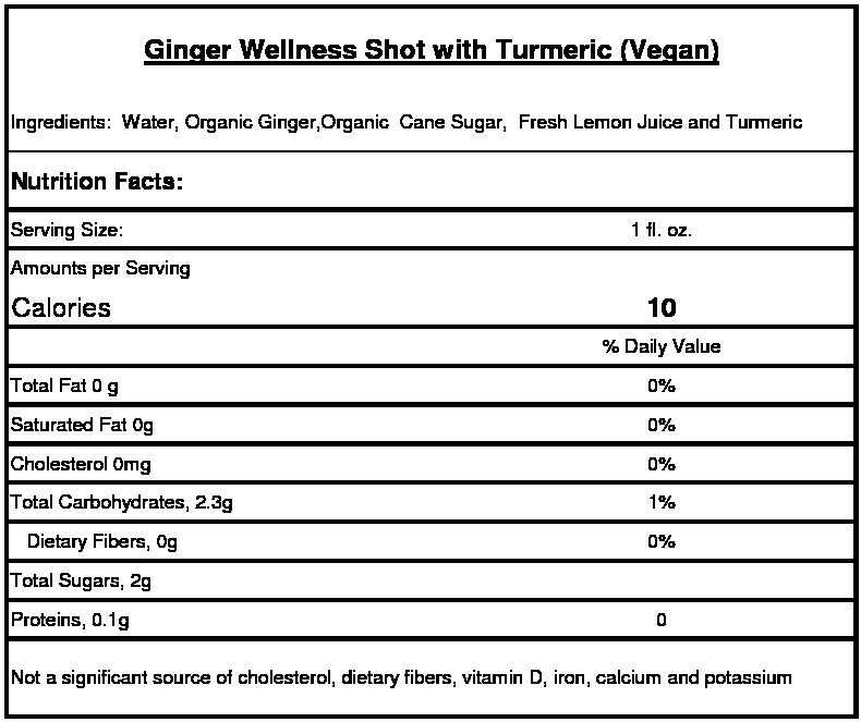 A vegan friendly Wellness Shot providing a healthy antioxidant dose ginger and turmeric in a convenient package. A potent combination to provide relief from inflammation ailments. Take it straight or use to flavor your choice of beverage. Made with organic cane sugar, it has only 10 calories per serving. Size: 16 fl. Oz Item Id: GCB07-01 Makes (16) 1 oz. shots Buy more product to get more discount and save extra with a flat shipping rate